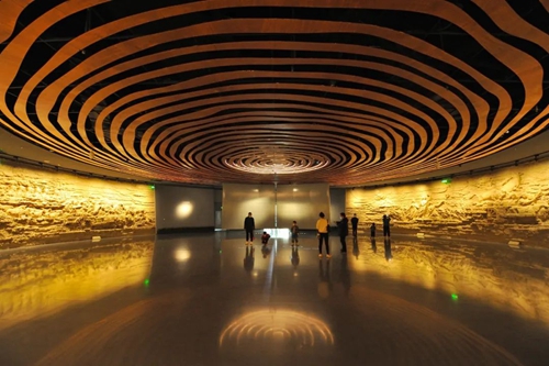 鄭州商代都城遺址博物院坐落于鄭州市市中心,序廳鏤空的洛陽(yáng)鏟造型,寓意鄭州商代都城是一座由考古發(fā)現(xiàn)的千年王都。巨幅環(huán)形浮雕講述先商和商代故事。地面投影與年輪頂飾上下呼應(yīng),寓意鄭州古今同地,歷史文化一直延續(xù),3600余年的歷史有其根源,數(shù)千年的繁華有本可依。