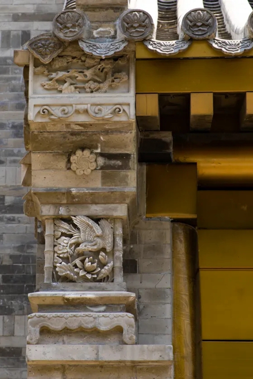 與之相對(duì)的17號(hào)樓主題為仙鶴,主題靈感來(lái)自于“仙鶴的故鄉(xiāng)”鶴壁。建筑上精美的墀頭也表達(dá)了此棟院子的主題,其上段位仙鶴,寓意松鶴延年,墀頭下端位仙鹿,寓意福祿綿長(zhǎng)。而這處雕刻精美又涵義豐富的墀頭設(shè)計(jì)來(lái)源于河南鶴壁的古城摘星臺(tái)公園。