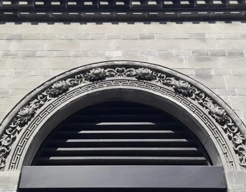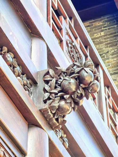 進(jìn)入北門,首先映入眼簾的是16號(hào)樓,其主題為壽桃,主題來(lái)源于信陽(yáng)鄧穎超祖居,祖居繡樓內(nèi)部裝飾有壽桃石雕,我們便選取此圖案進(jìn)行創(chuàng)作,在16號(hào)樓的墀頭、雀替、卡子花處均有精美的壽桃紋樣。