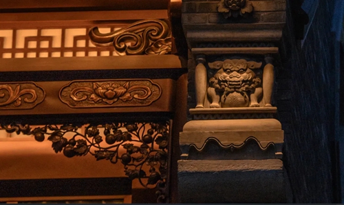 12號(hào)樓主題為獅子,主題來(lái)源于三門峽靈寶函谷關(guān),象征“事事如意”的獅子在柱子、平板枋、額枋、卡子花、假梁頭等構(gòu)件均有出現(xiàn)。