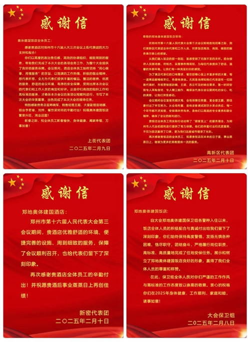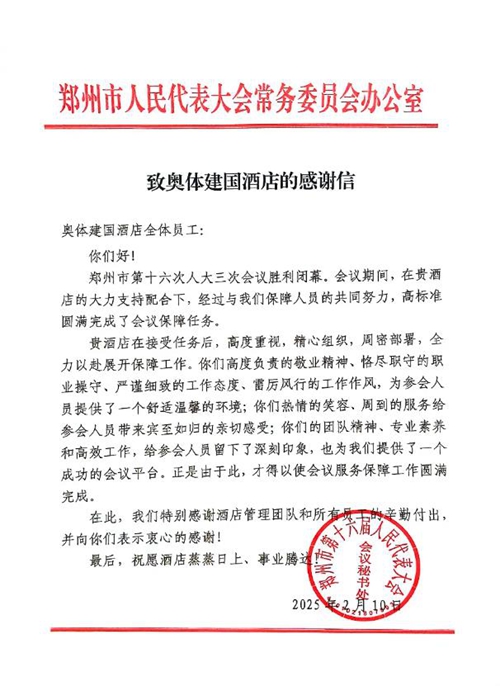 2025年2月10日,鄭州市第十六屆人民代表大會(huì)第三次會(huì)議第二次全體會(huì)議勝利閉幕。鄭州城市發(fā)展集團(tuán)旗下河南鄭地奧體建國(guó)飯店作為本次大會(huì)的駐地保障酒店,以“五星”服務(wù)標(biāo)準(zhǔn)(環(huán)境舒心、食宿貼心、細(xì)節(jié)暖心、保障安心、文化潤(rùn)心),圓滿完成了各項(xiàng)接待任務(wù),贏得了與會(huì)代表和會(huì)務(wù)組的一致好評(píng)。