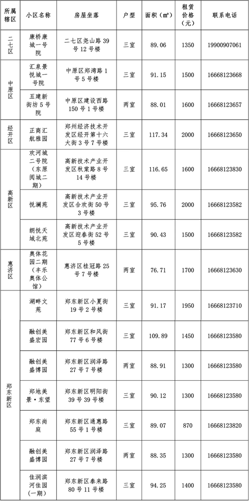 本批次配租房源共計15套(41間),其中為二七區(qū)1套(3間)、中原區(qū)2套(5間)、經(jīng)開區(qū)1套(3間)、高新區(qū)3套(9間)、惠濟區(qū)1套(2間)、鄭東新區(qū)7套(19間)。水電費均為民用水電標(biāo)準(zhǔn),房源精裝修交付,周邊配套設(shè)施齊全,配備家具家電,拎包入住,后續(xù)房源將根據(jù)裝修進(jìn)度情況陸續(xù)配租,具體以系統(tǒng)實際上線為準(zhǔn)。